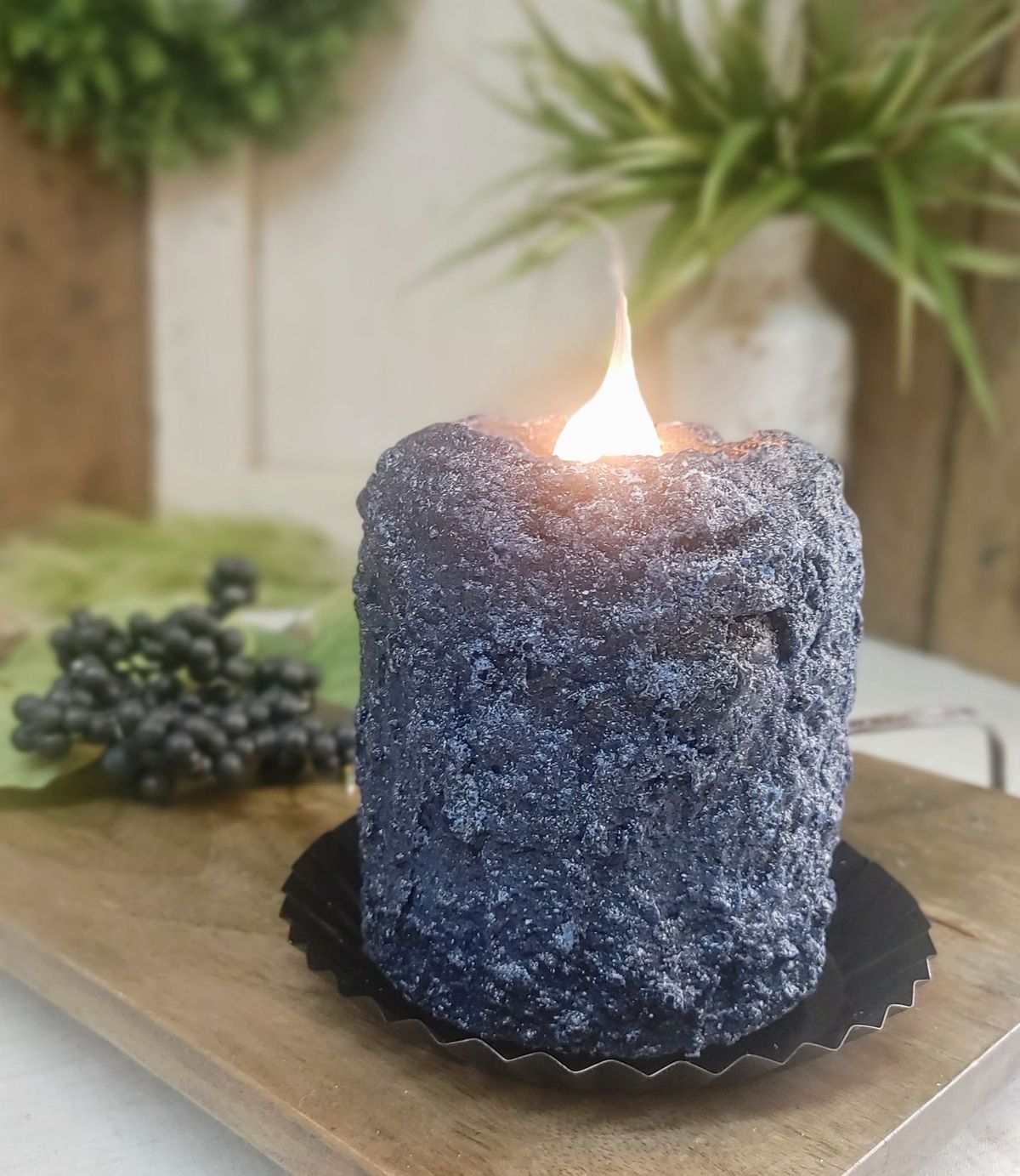 This candle has our timeless signature, lumpy bumpy exterior, and provides a beautiful glow to any room when burning. Size: 5″ tall x 4.5″ diameter weight: 2 lbs. Formula: 100% cotton wick, paraffin wax Burn Time: up to 150 hours. Handmade in the USA, Freshly picked blueberries, hand-churned butter, flour, and sugar are what you would need to reproduce this comforting aroma.